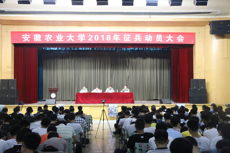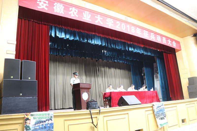 为了扎实做好我校2018年大学生征兵工作,校武装部、征兵工作站于5月25日,在大礼堂召开安徽农业大学2018年征兵动员大会,对全校2400余名男生开展征兵动员。校武装部部长、征兵工作站长涂德润、琥珀街道征兵工作领导组组长袁智、琥珀街道征兵办公室主任韩磊、校征兵工作领导组办公室秘书戴晟参加。