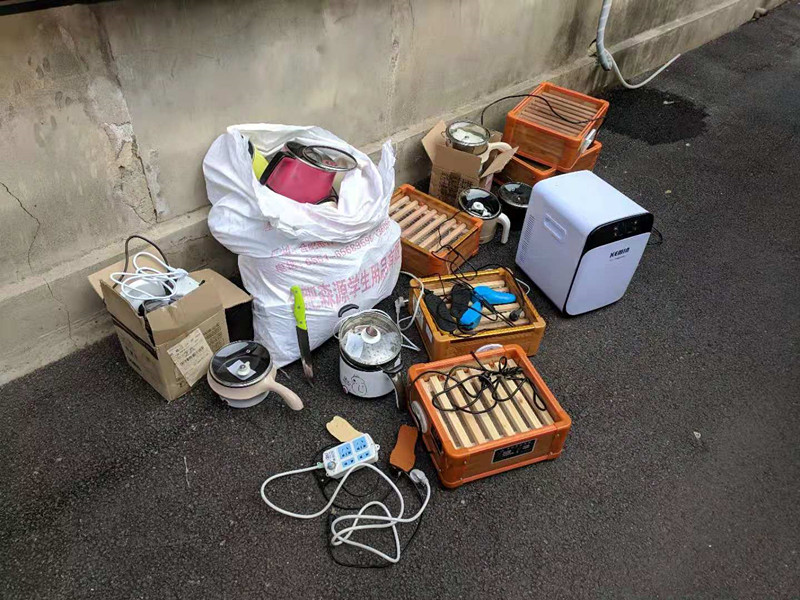本次“回头看”选择两个学院所在的校内七、八号楼(前期检查问题突出),经过对每间宿舍进行仔细检查,共查缴:可调节功率多用插座6个,电饭锅20个,多功能暖脚器5只,烘靯器4副,挂烫机1台,管制刀具1把,小型电冰箱1台(其中大部分为“三无”产品),共涉及29间寝室,另外有相当部分寝室摆放有米、面条、油盐酱醋等未加工食材,却未发现炊具。“回头看”结果显示,相比前期检查隐患不仅未消除,且越发严重。