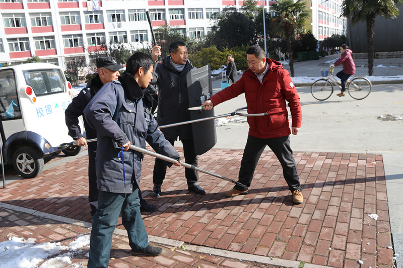 为切实提高我校安全保卫工作人员的反恐防暴意识和面对恐怖事件的合理处置能力,1月10日上午十时,在琥珀派出所民警的指导下,我校保卫处工作人员在图书馆楼前开展反恐防暴演练。