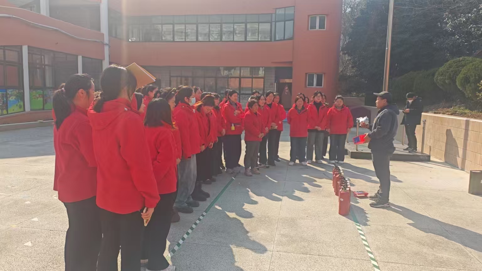 消防宣传员向园内教工讲解了火灾危害、逃生技巧及报警方法,现场示范了灭火器"提、拔、握、压"等操作步骤,并指导教工实操演练。