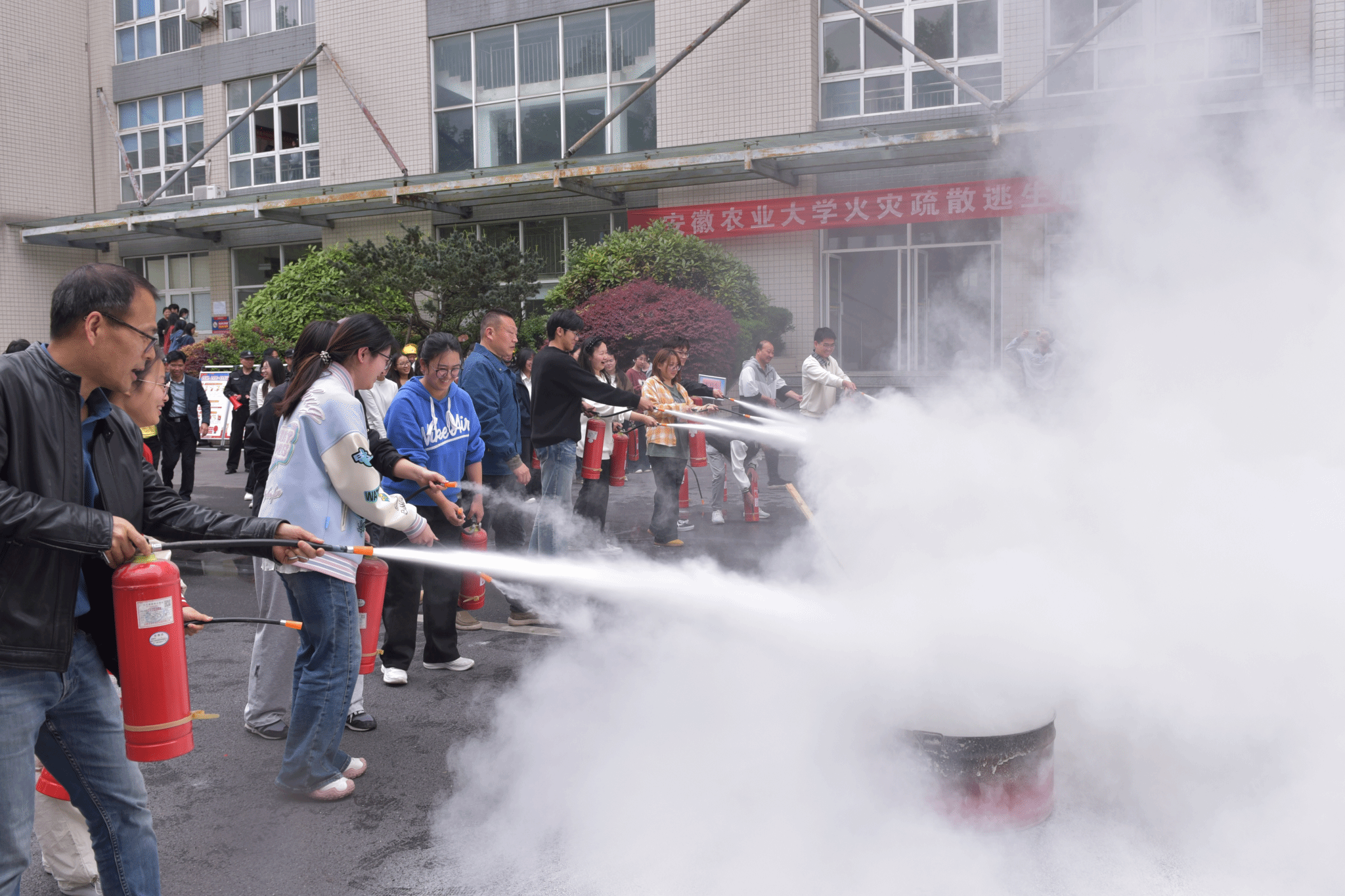 下午,模拟火灾疏散逃生应急演练有序开展,校党委副书记董雨,校党委常委、副校长蔡德军到场指导,总务部、实验室与设备管理处、人工智能学院、电子与电气工程学院等单位负责人参加活动。演练以校园突发火情为实景模拟,应急救援队员与学校安保队伍协同联动,实战演练快速疏散、精准灭火、紧急救护等环节。师生亲身体验灭火器操作、火场逃生等实操训练,切实提升了应急避险、自救互救能力,达到“以演筑防、以练备战”的良好效果。