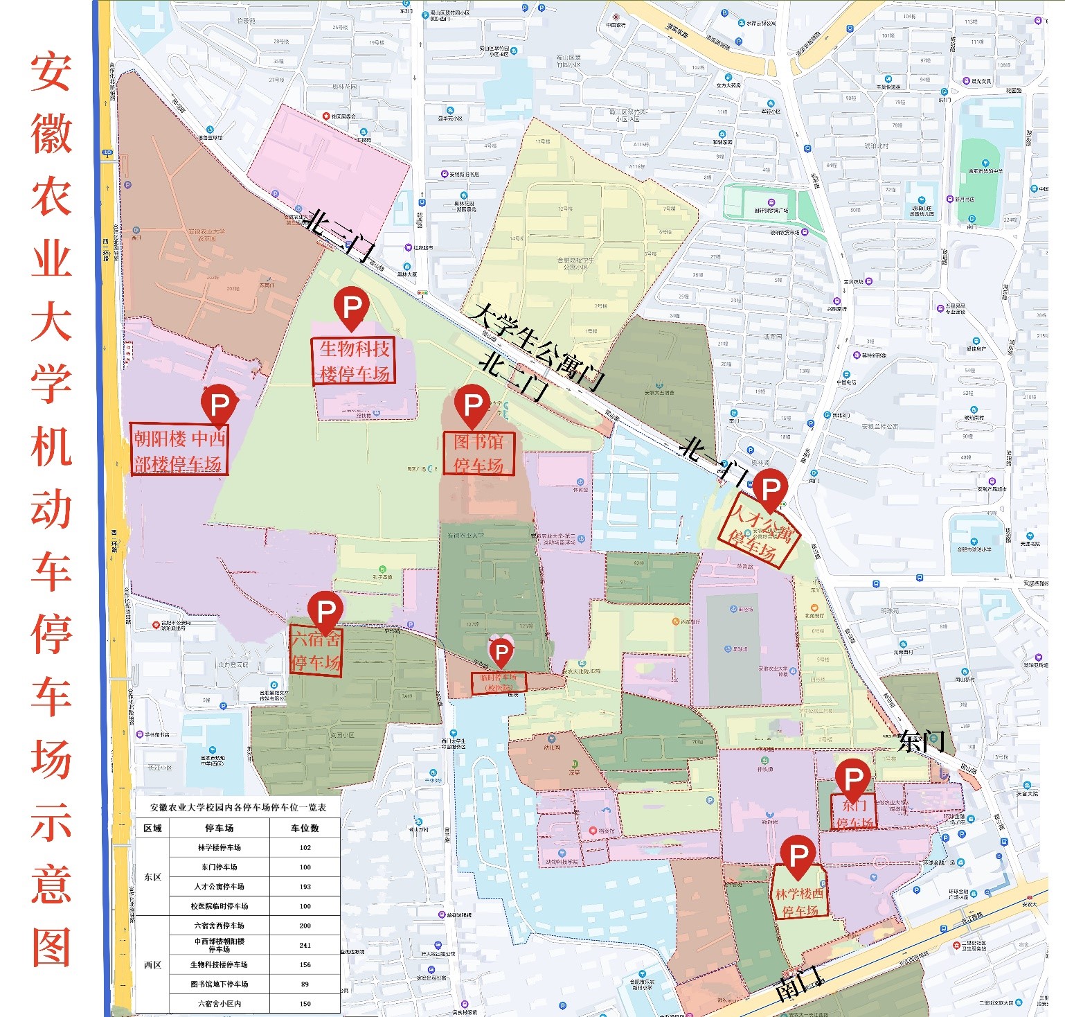 校内机动车停放设置8个停车场,分别为:(1号)林学楼停车场、(2号)东门停车场、(3号)人才公寓停车场、(4号)图书馆地下停车场、(5号)生物科技楼停车场、(6号)六宿舍停车场、(7号)朝阳楼和中西部楼停车场、(8号)校医院临时停车场,具体位置详见附件示意图。