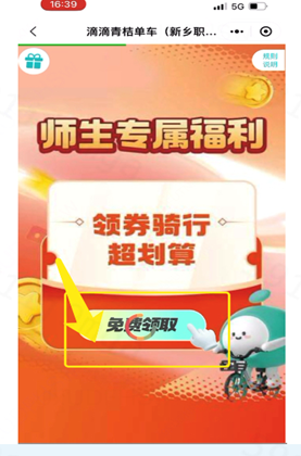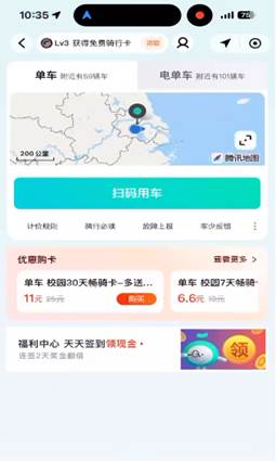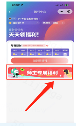 2.首页选择单车—福利中心—进入福利中心—点击师生专属福利。