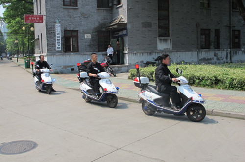 为确保校园安全,保卫处建立了由电动自行车巡逻与徒步巡逻相结合,着装巡逻与便衣巡逻相结合,监控摄像分析与蹲点守候相结合的校园治安防控体系。实行校园常态化巡逻制度,抽调精干人员组成校园巡逻队,变被动“防守”为主动“出击”。在巡逻中加强校园治安防范,在巡逻中打击校园违法犯罪分子,在巡逻中清理校园违章摊点、违章停车、闲杂人员,在巡逻中为广大师生员工提供安全服务。为迎接我校“两代会”的顺利召开,创建良好的校园治安环境。