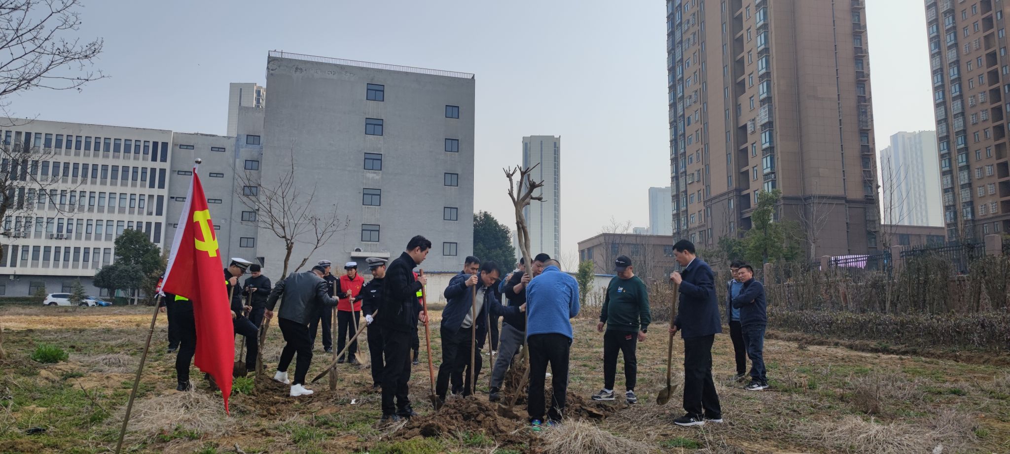 在交警蜀山大队教导员徐民召和保卫处党支部书记任建东的带领下,两个支部的全体党员分工合作、凝心聚力,挖坑、栽苗、培土、浇水,每个环节都井然有序、一丝不苟,在大家的共同努力下,很快便完成了苗木的栽种,一颗颗绿苗迎风而立,展现出盎然生机。