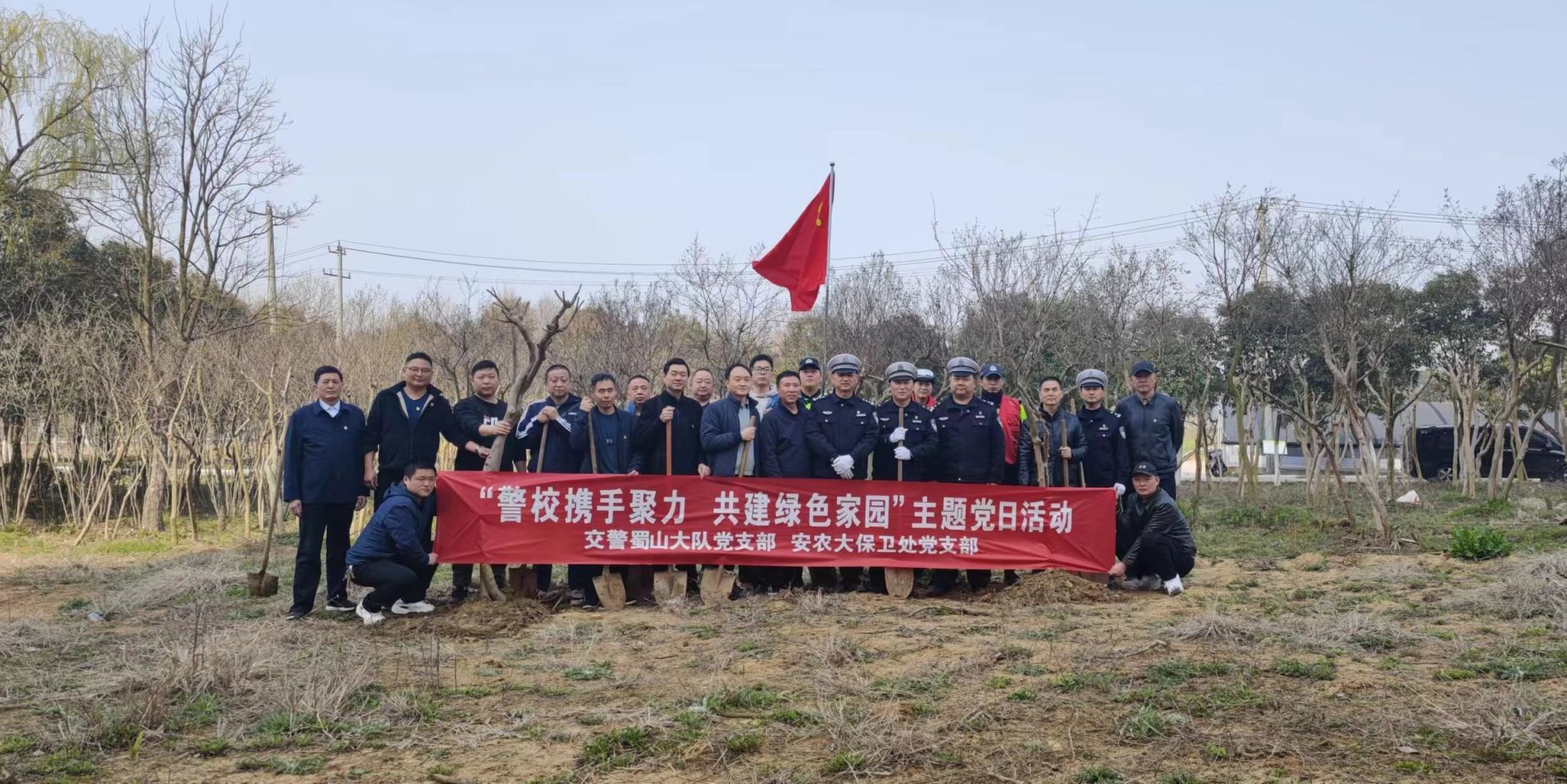 本网讯 风清气正,树木树人。在植树节来临之际为进一步加强生态文明建设,增强党员义务植绿护绿意识,3月12日上午,保卫处党支部联合交警蜀山大队党支部在农业园开展了主题为“警校携手聚力 共建绿色家园”主题党日活动。