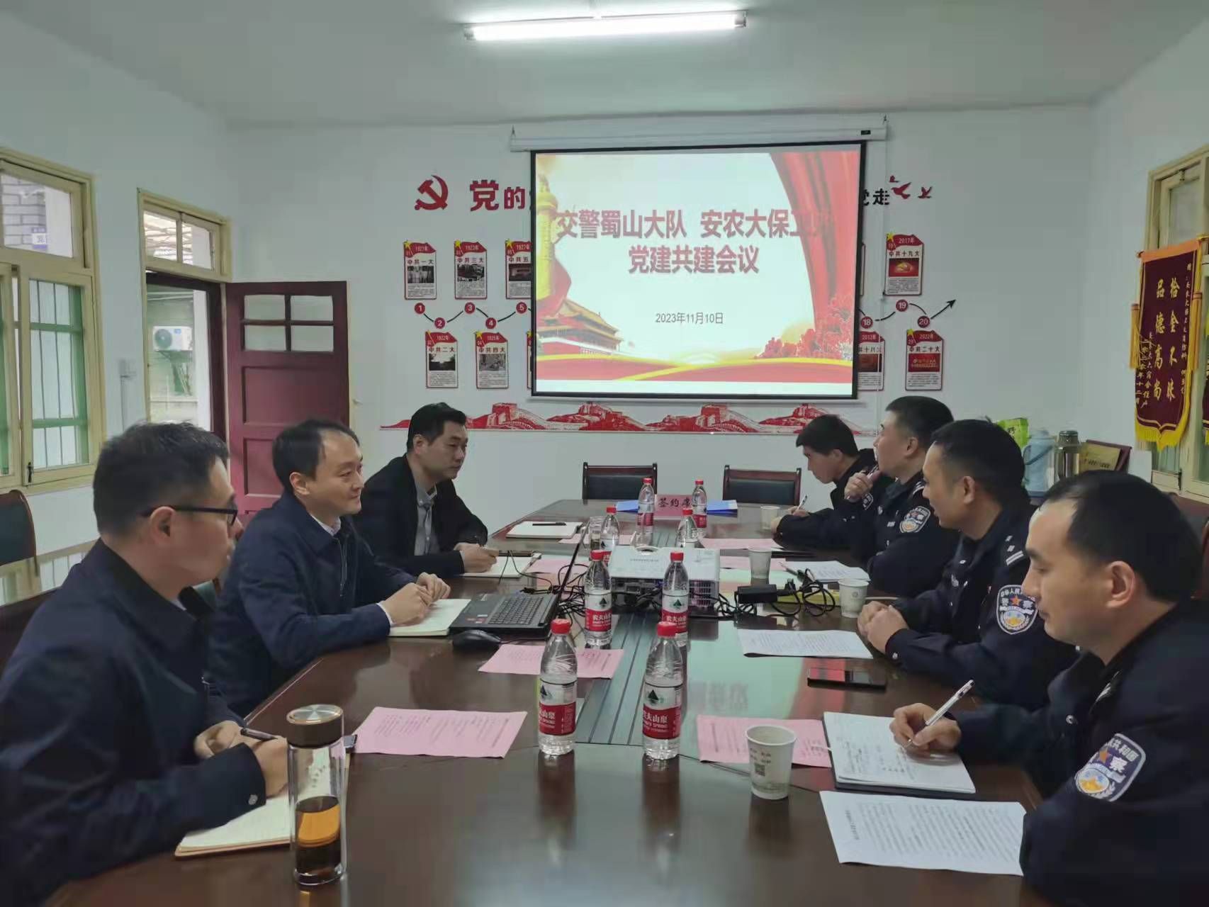本网讯 为充分发挥党建引领作用,实现资源共享、优势互补、共驻共建,为师生提供高质量的交通服务保障,11月10日,保卫处党支部联合交警蜀山大队党支部开展党建共建活动,交警蜀山大队教导员徐民召一行4人来校参加交流,活动由保卫处副处长任建东主持。